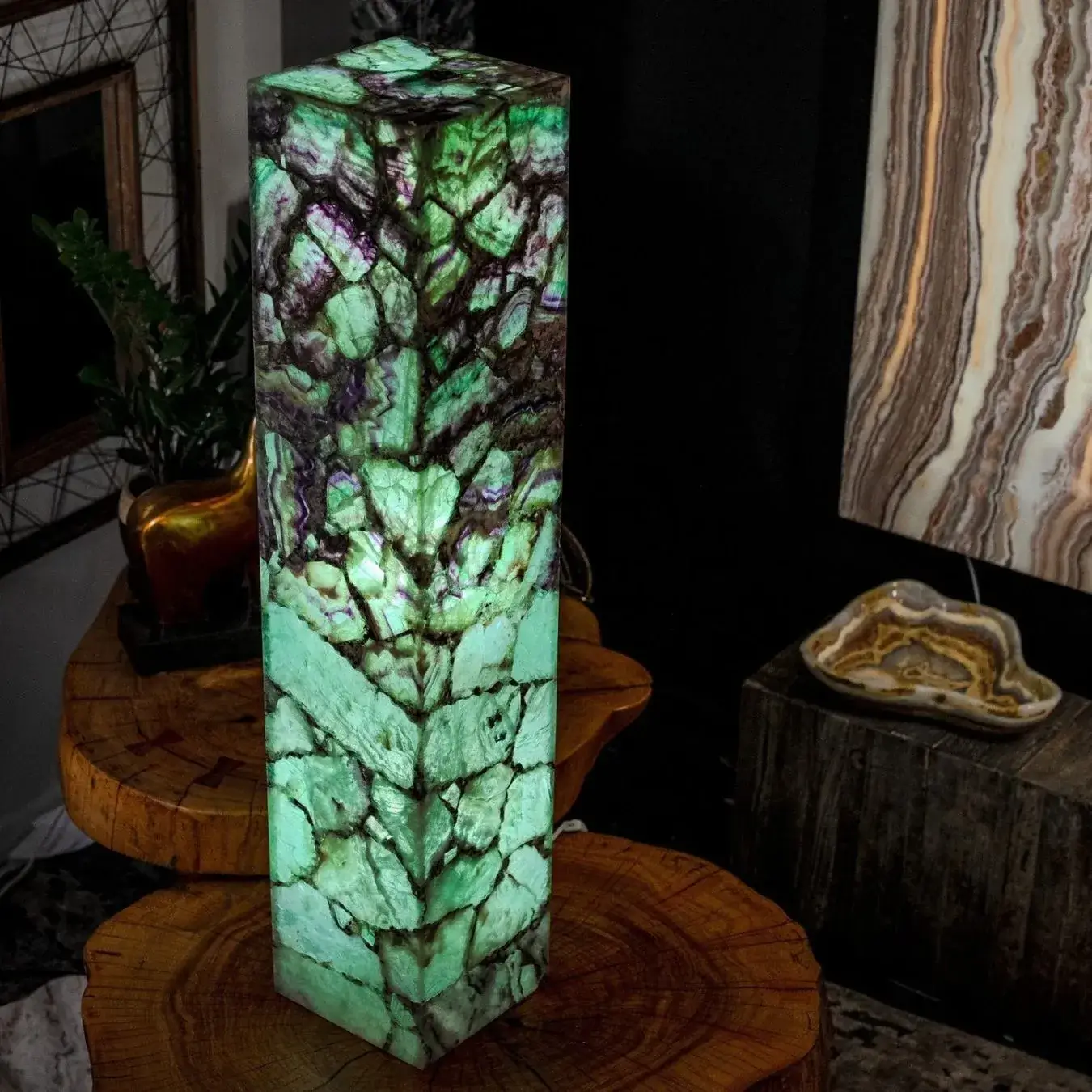 Say hello to our Fluorite Towers Collection – handmade art pieces. We’ve made some beautiful lamps and bowls from bright green fluorite and deep onyx stone, which we get from our trusted quarry of 45 years.
