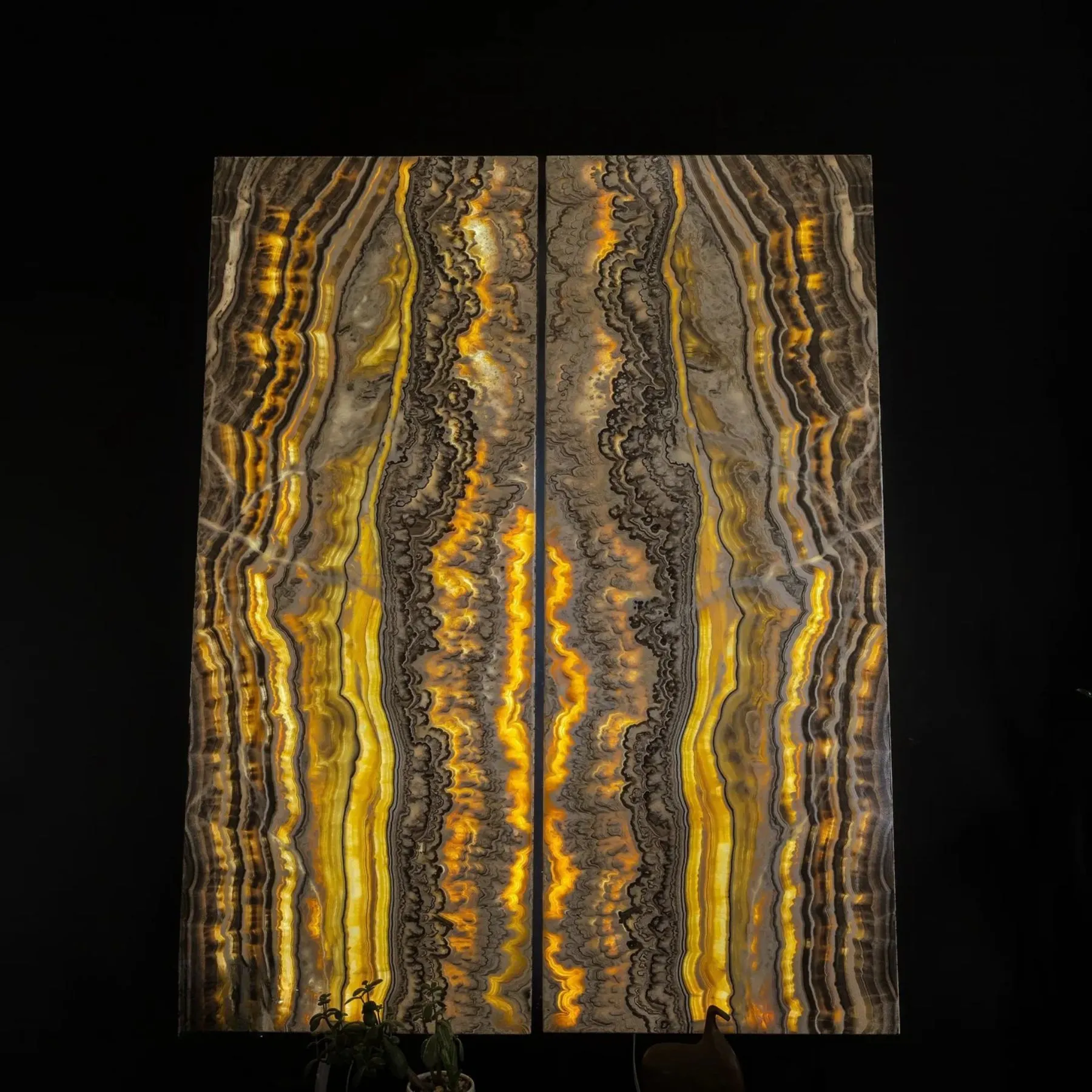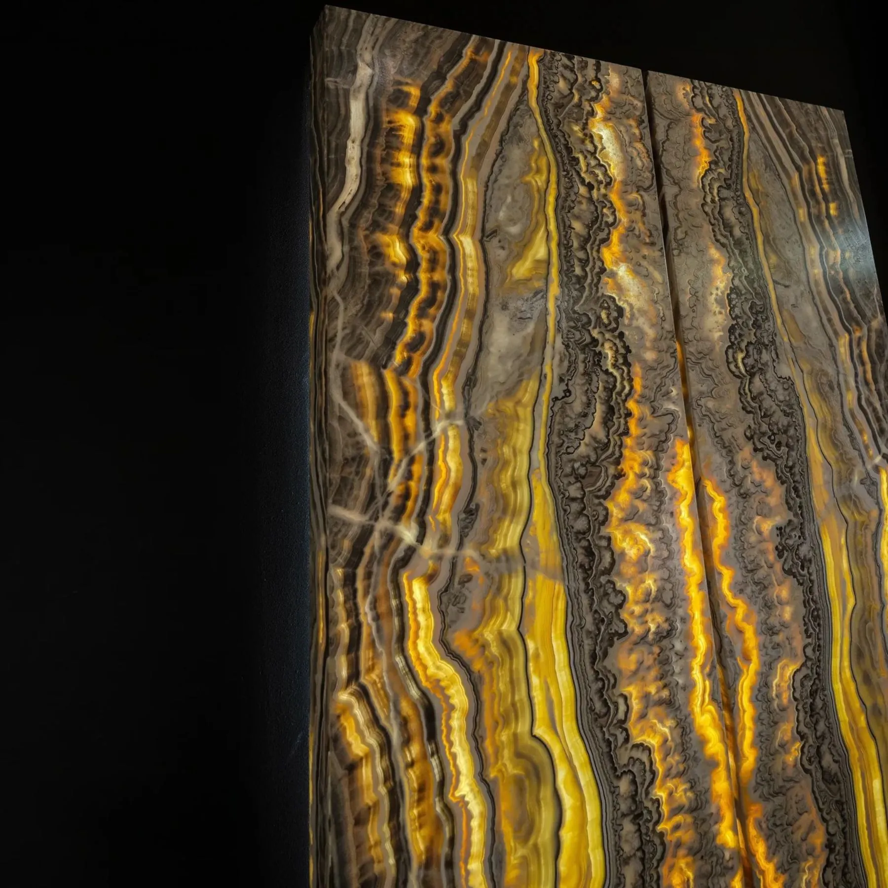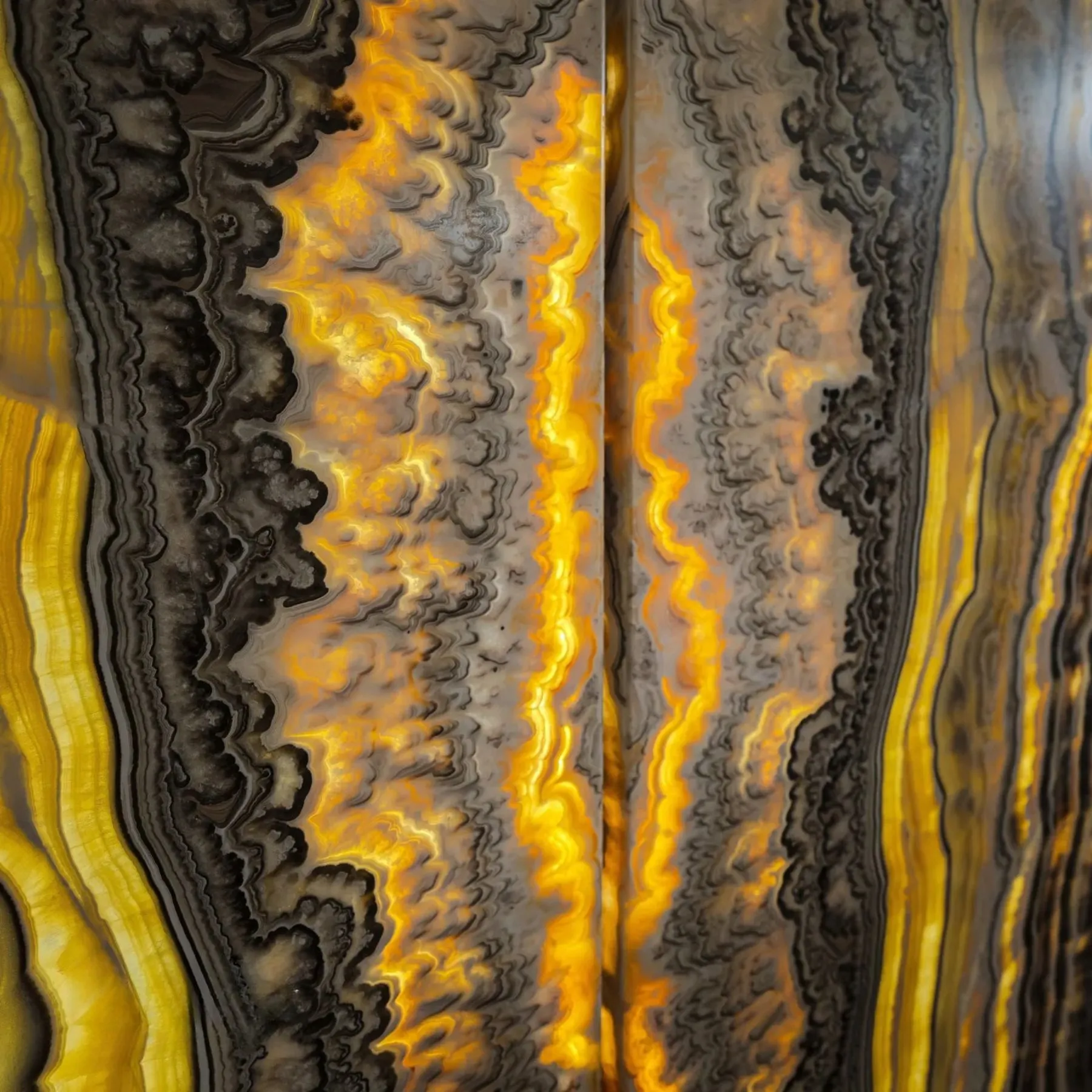 Golden Cloud Onyx is more than a design element; it’s a portal to a majestic world of nature through stone. Backlit to reveal its luminous depths, each onyx panel casts a soft, ambient glow—perfect for creating a tranquil, inviting atmosphere. Every panel showcases unique banding and color variations, making your chosen piece truly singular and exclusive.